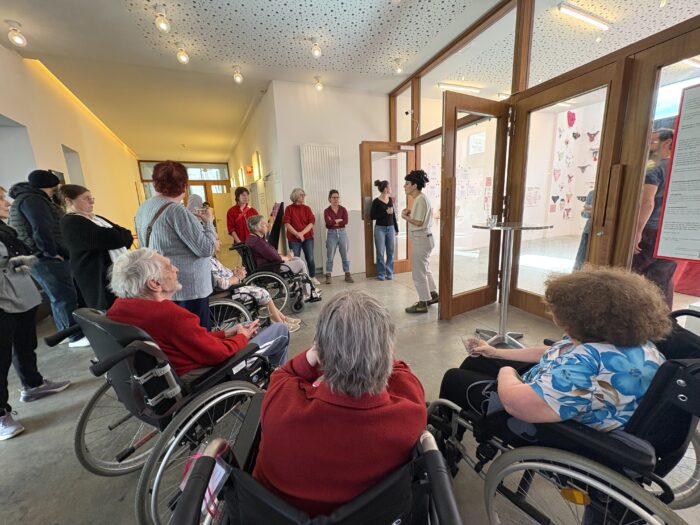 Alice Conquand et Coralie Theys ont animé une visite de l’exposition Menstruosités pour une quinzaine de résident·es du Clos Bizet.