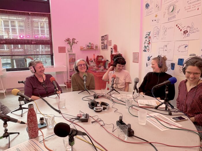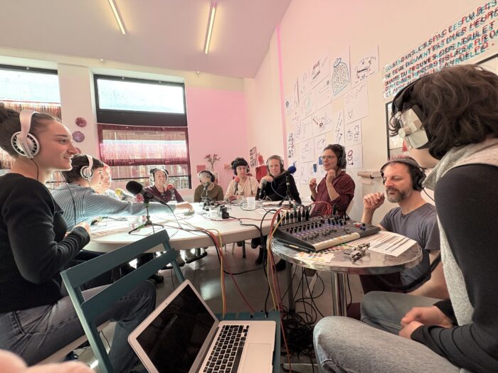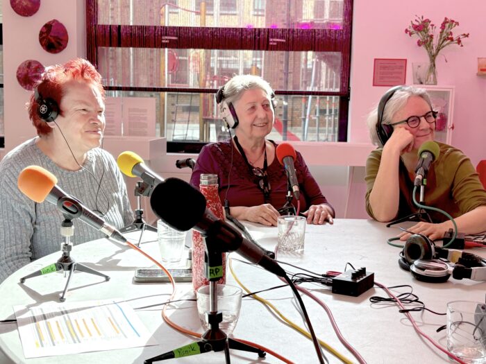 Ensuite elles ont rejoint le plateau radio installé au centre de l’exposition et entamé une discussion croisée avec Nelly et Françoise, résident·es du Clos Bizet, Catherine, chargée de projets à la maison de repos, les mouettes Emma et Marie et Anne-Louise à l’animation.